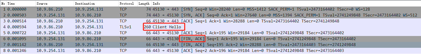 ①. 可以看到 github 服务器收到 SSL Client Hello 包后主动关闭了连接